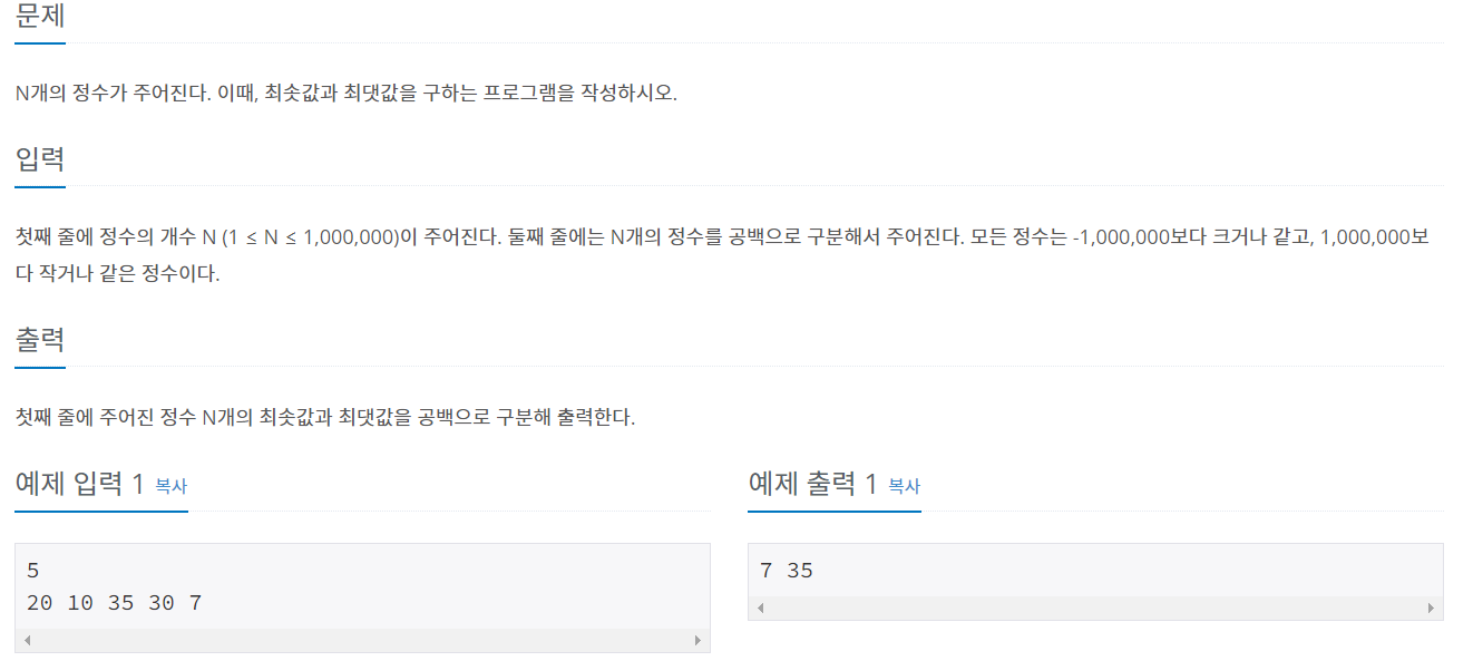 123cnt = int(input())numbers = list(map(int, input().split()))print(min(numbers),max(numbers))cs 'Python > 개념학습' 카테고리의 다른 글